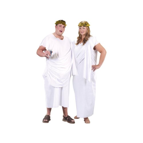 Get ready to TOGA!! Our unisex plus size Toga costumes features robe with attached shoulder drape and gold laurel wreath headpiece. One size fits adults up to 275 lbs and 6'2" tall. Also fits women's dress sizes 16-20.